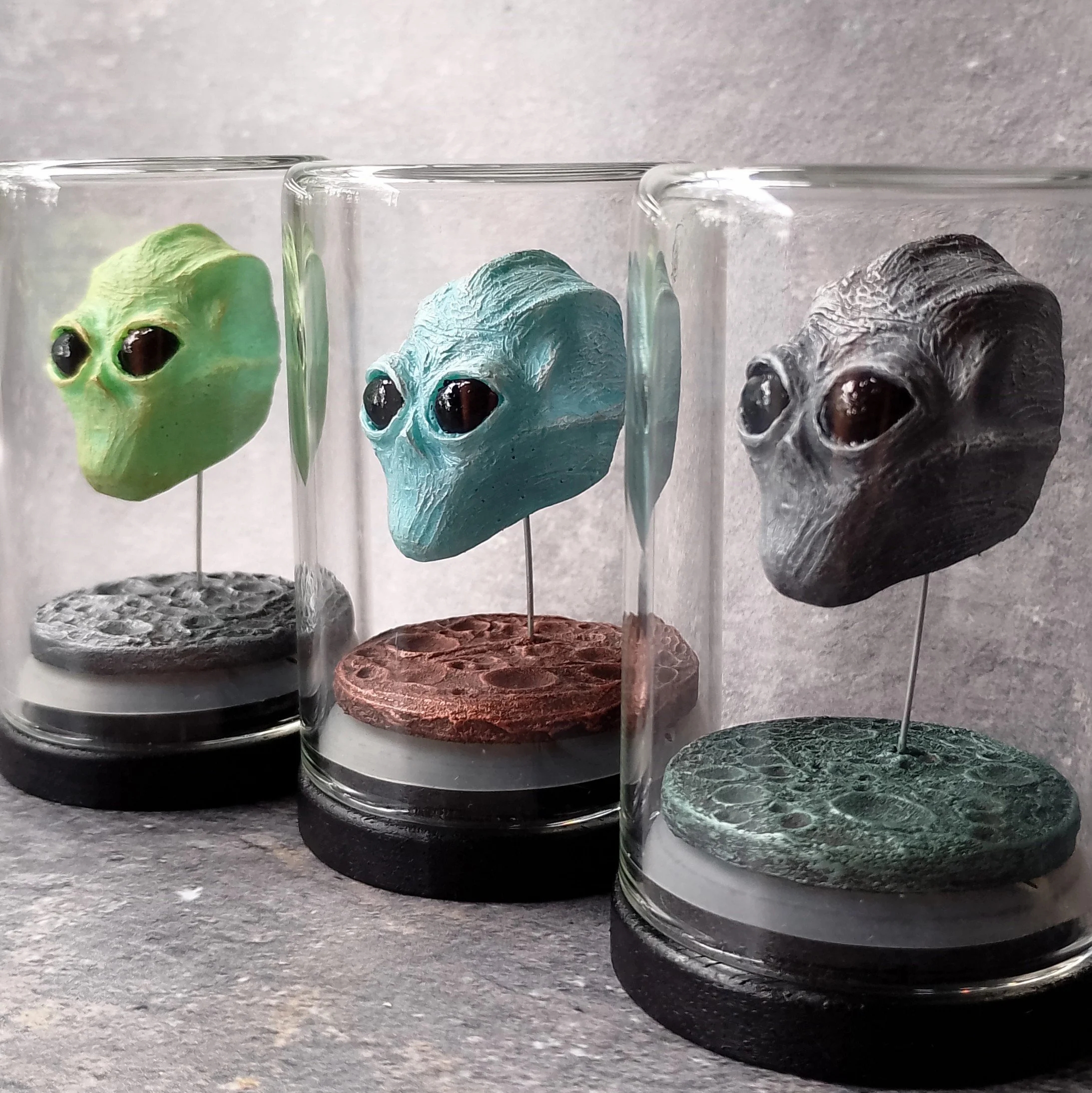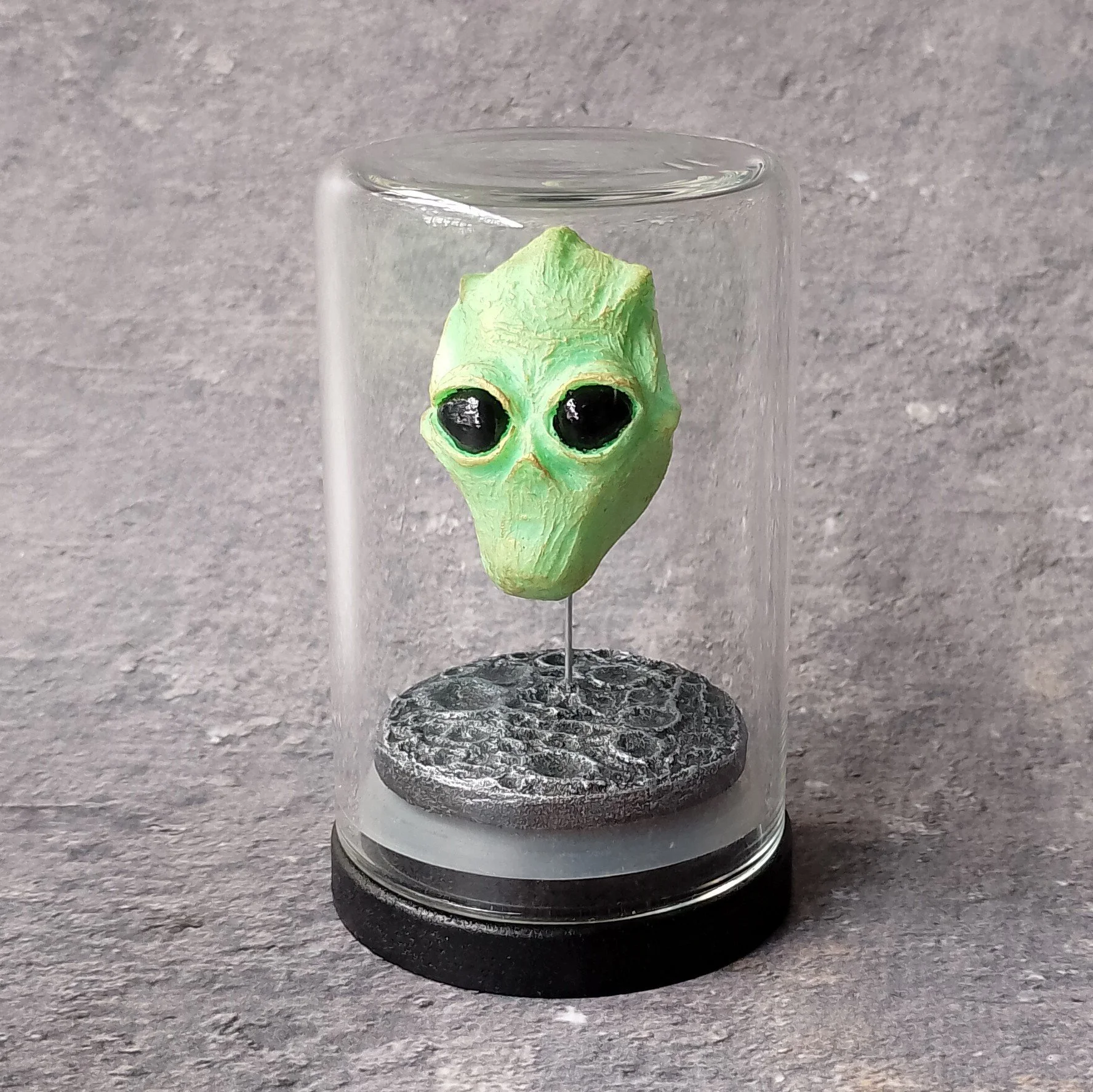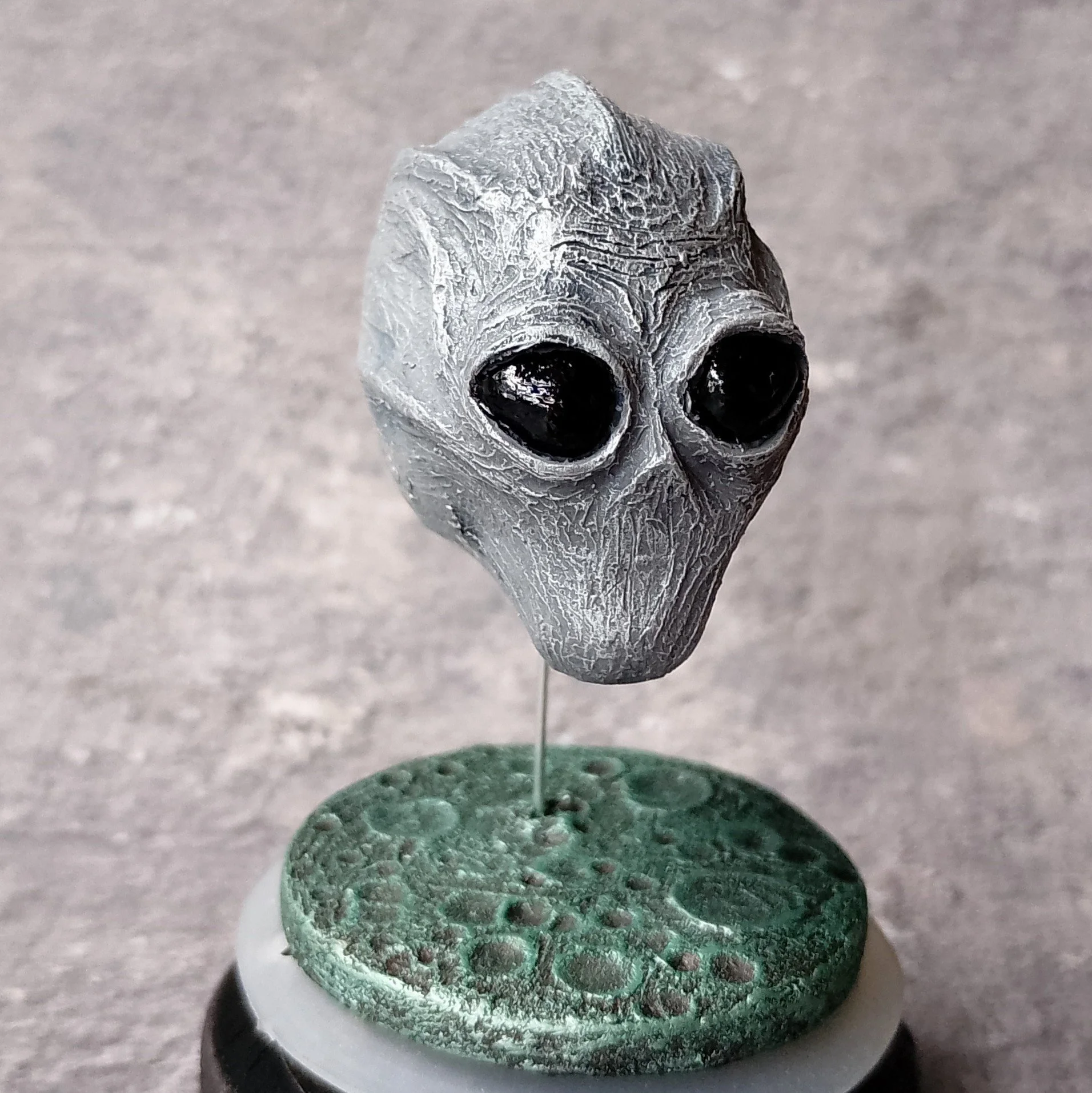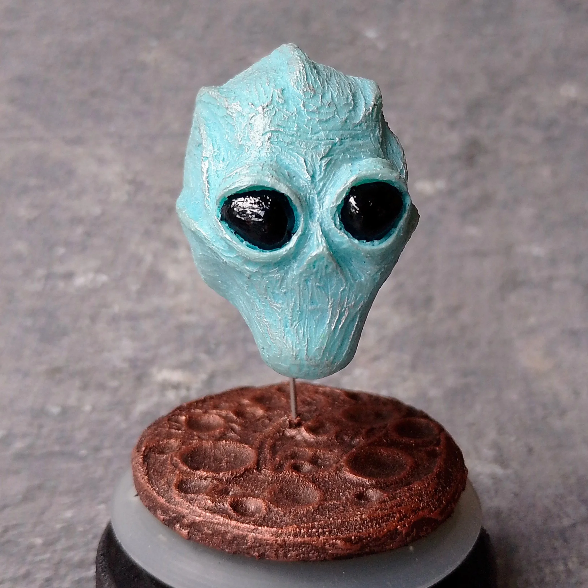 Small alien head specimen mounted on wire over a cratered planet surface.